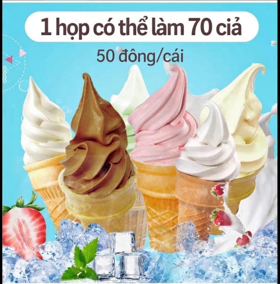 Bột kem mềm cao cấp – được hàng ngàn chuỗi F&B lớn, quán trà sữa, nhà hàng tin dùng. Chỉ 1kg bột + 2.5–3 lít nước → làm được 70–80 cây kem hoàn hảo. Có sẵn 4 hương vị bán chạy: Vani thơm ngậy, Socola đậm đà, Dâu tây ngọt mát, Matcha. Kem ra mịn màng, không dăm đá, giữ dáng đẹp lâu, tan chậm. Hương vị tự nhiên, tương thích mọi máy kem mềm.